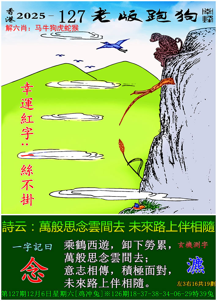 老版跑狗一字記之曰:【念】 詩云:萬般思念雲間去,未來路上伴相隨。乘鶴西遊,卸下勞累,萬般思念雲間去;意志相傳,積極面對,未來路上伴相隨。玄機測字:《濃》
